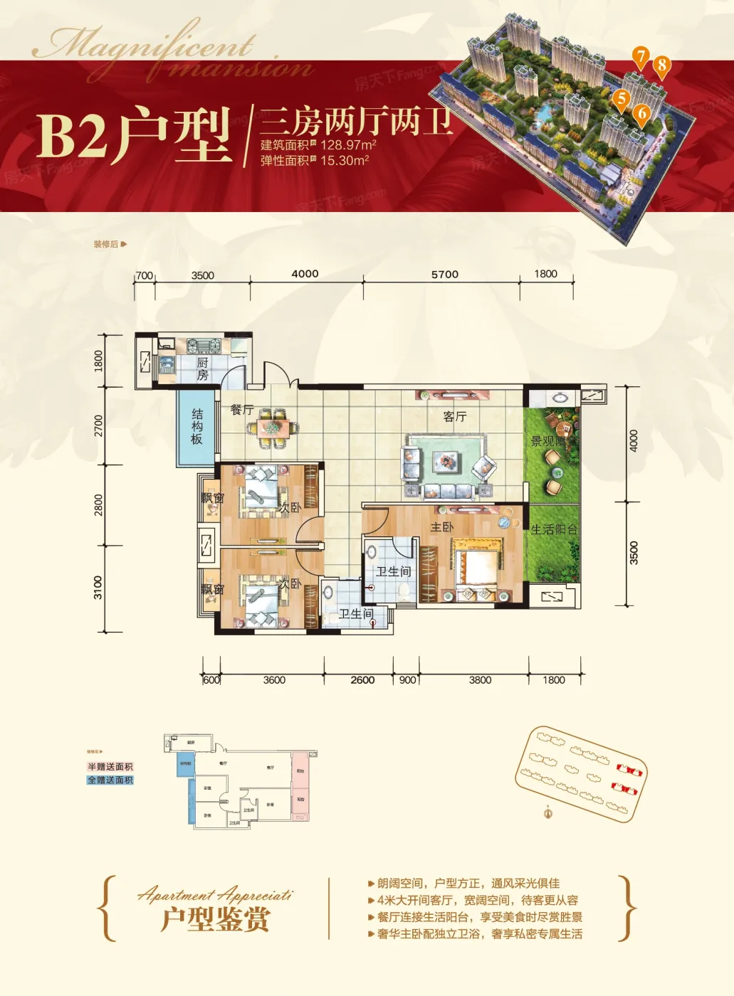 小区配套设施:小区采用了三重绿化即:宅前绿化、组团绿化和社区绿化。并依据自然地势起伏打造出近万平米的大型中央园林,各种名贵植物散布在小区的每个角落,当您和家人在园区里面休闲散步的时候,从任何角度看都是满目的翠绿,您就是每天“生活在公园里”。 园林内更设置儿童游乐区,提高孩子的活动兴趣;还有以运动、健身、休闲活动为主题的休闲养身区,漫步小径,健身器械分布于园林中,营造出浓浓的健康养身气氛。1000平米的中心园林,配置了游泳池、篮球场、羽毛球场、室外健身场地、休闲凉亭等,呈现一场奢美的景观盛宴。高品质的居家环境,充分体现您荣耀、尊贵的身份与地位。