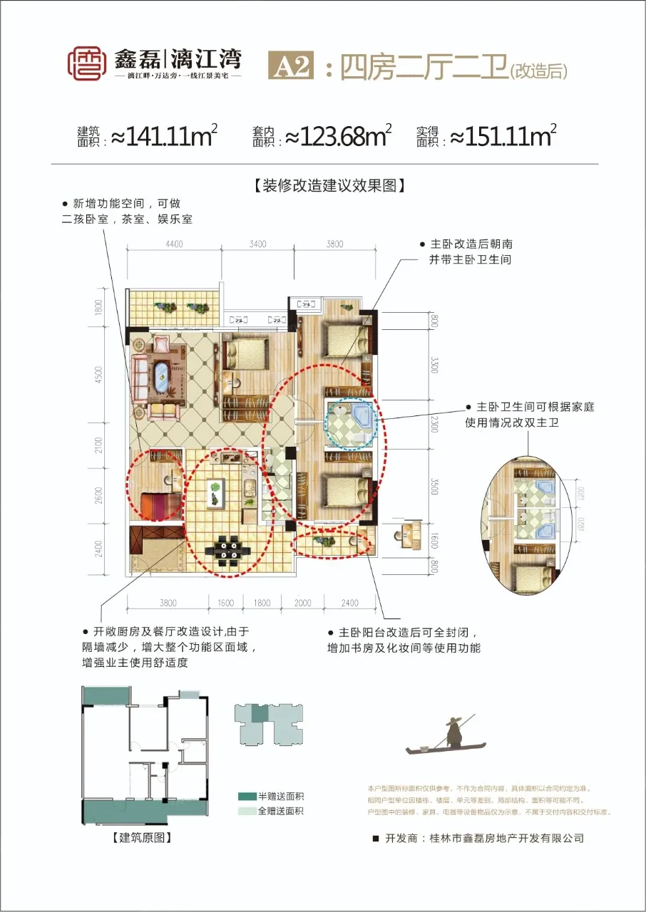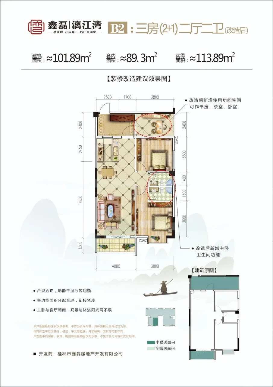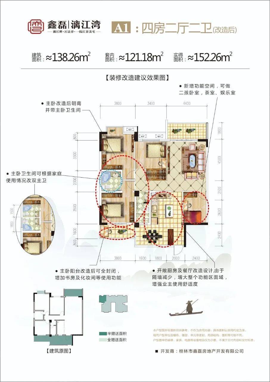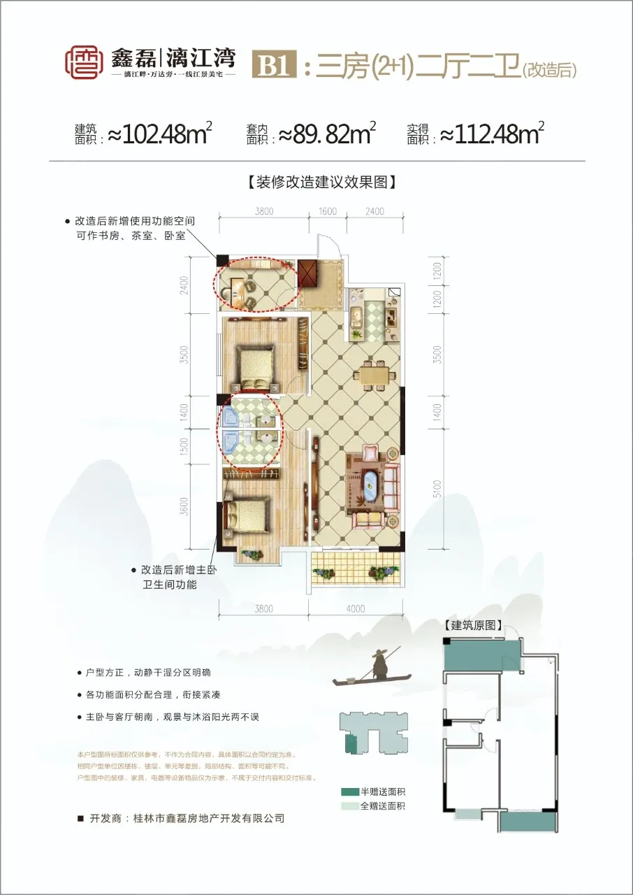 鑫磊漓江湾占地37亩,建筑面积约51500平方米,共14栋楼,一期推出一梯一户,一梯两户亲地建筑,部分房源可直观漓江、塔山,居于此幽静而不喧闹,绿化率达34.5%,面积约15000㎡的中式园林,将打造 舒适的社区。园林景观以中式园林为主,按照5重园林标准,原生绿化构筑园区多重生态景观,不露人工修饰痕迹,理水讲求曲折有致,功能上讲求“可望、可行、可游、可居”,以人为本。人性化的建筑与景致融合,回归悠闲自然的生活。不仅仅是一座社区,更是一种生活理念。