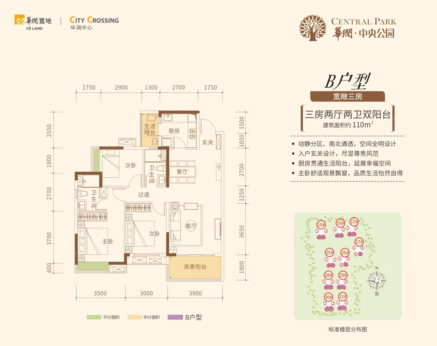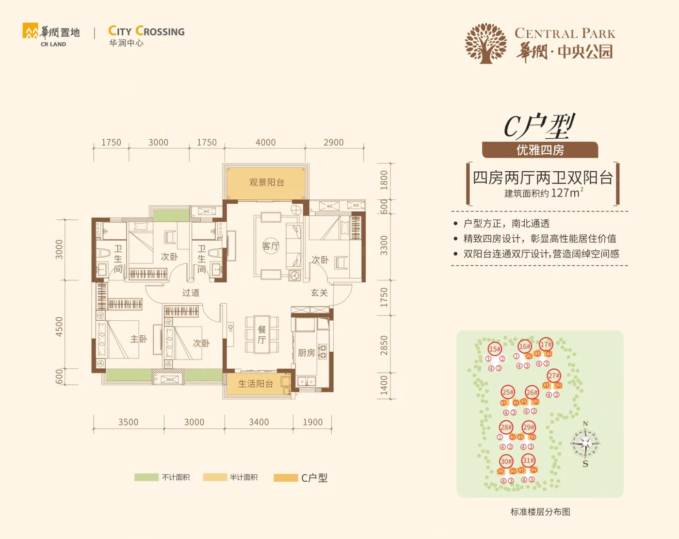 中央公园总占地面积约129亩,住宅建筑面积约23万㎡,总户数2041套,规划有28栋高层住宅。均为2梯4户产品,点式布局。